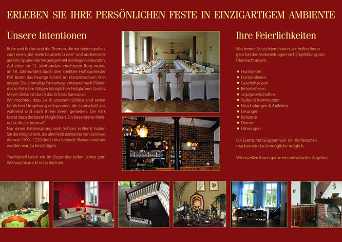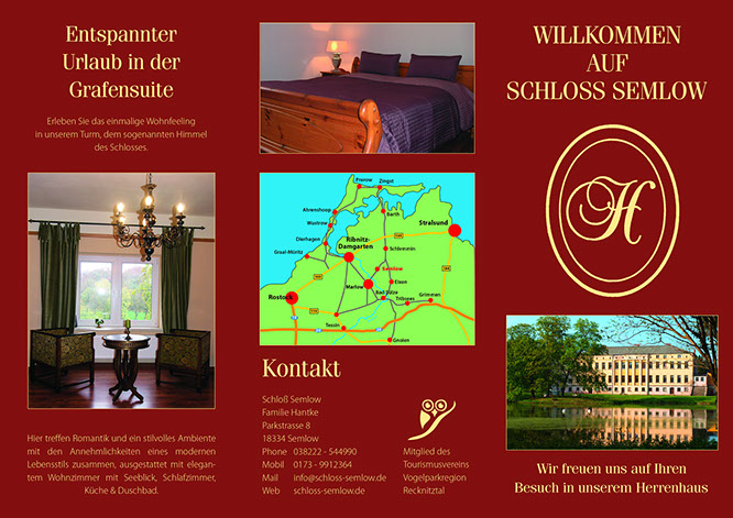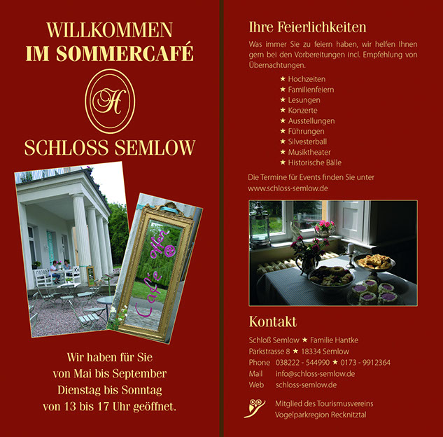 Vorderseite eines sechs-seitigen Faltflyers zum Schloss Semlow.
