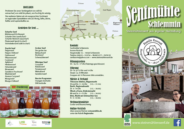 Titel und Rücktitel des doppelseitigen Flyers (Leporello) für die Senfmühle in Schlemmin 2019